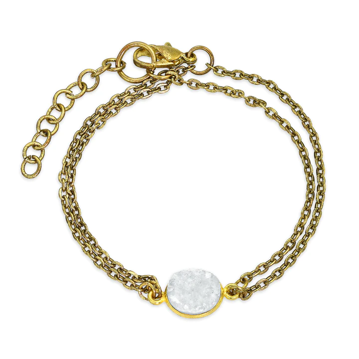Complete your look with this beautiful gold tone bracelet. Featuring a white Drusy center accent with a double chain bracelet.